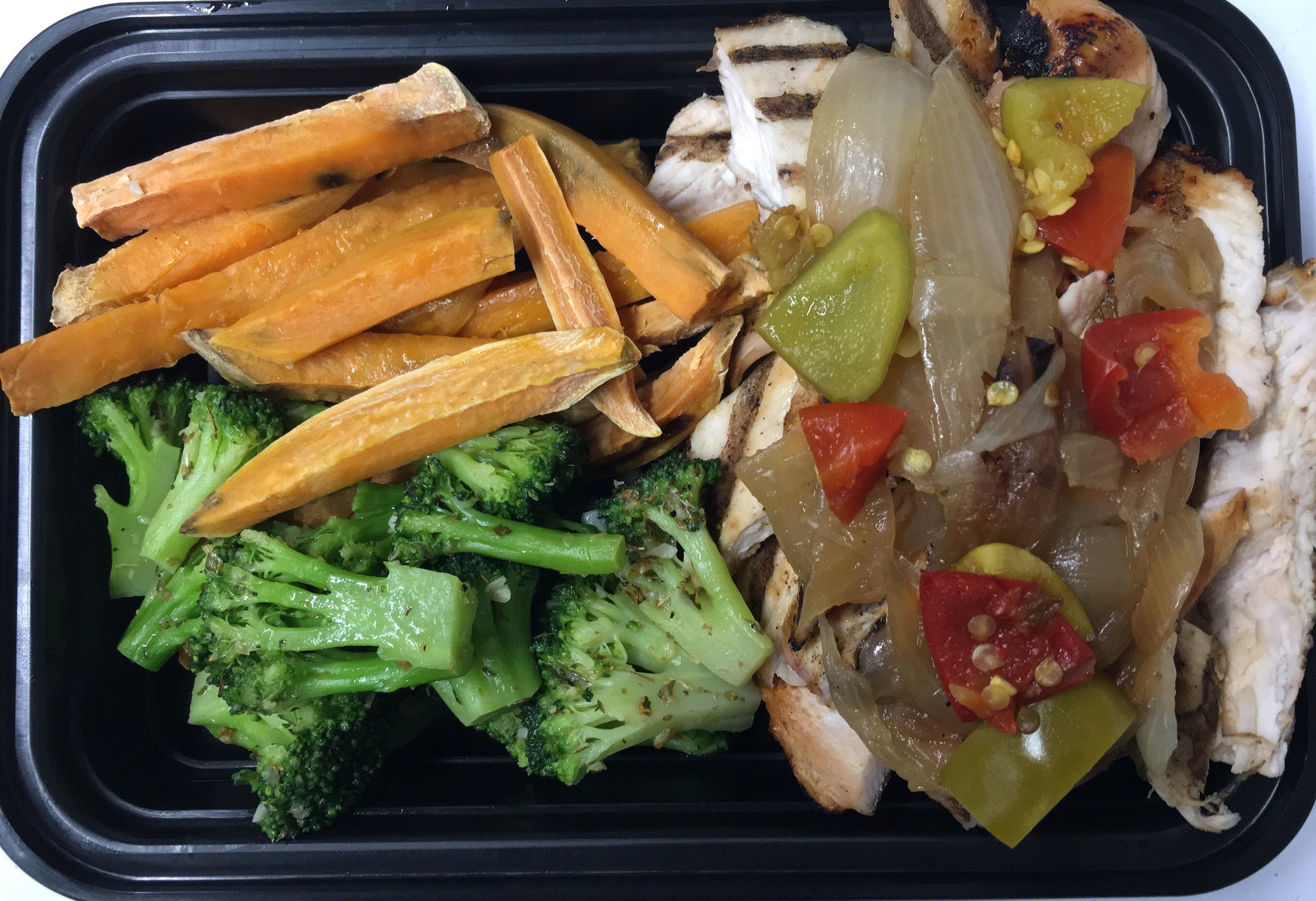 8 ounces of grilled chicken topped with hot cherry peppers & grilled onions; Side of lightly sauteed broccoli and homemade baked sweet potato fries.